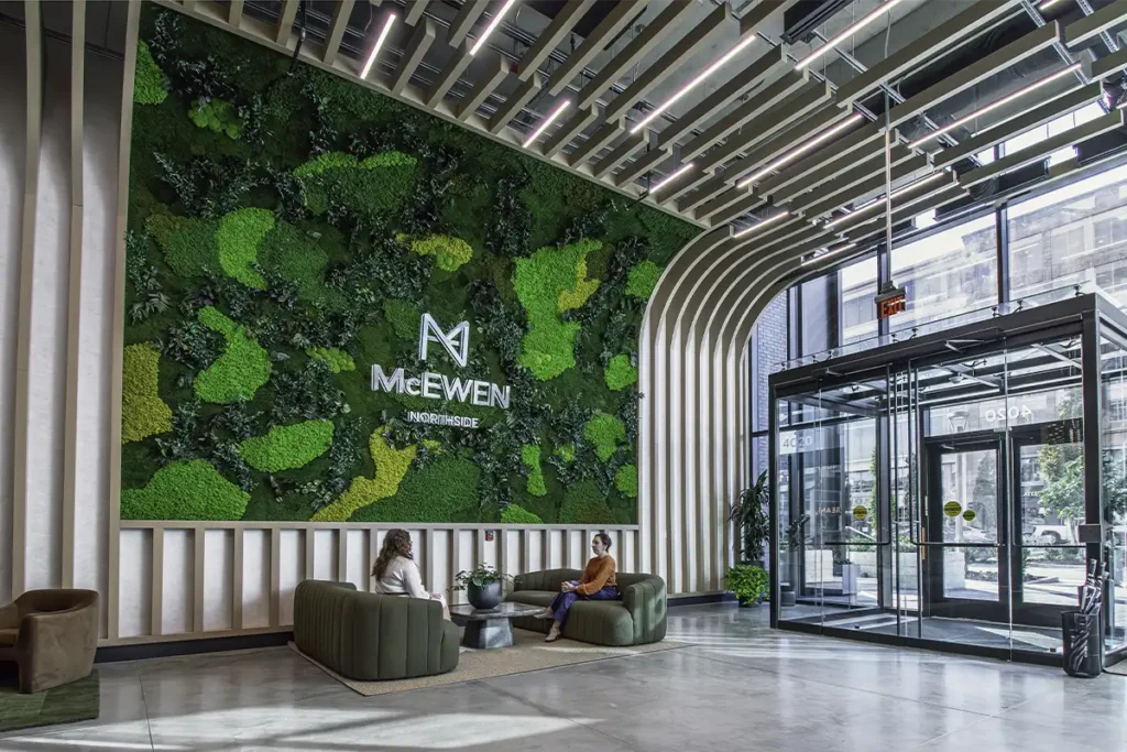A custom preserved moss wall anchors the McEwen Northside lobby, one of Franklin’s most prominent mixed-use developments.