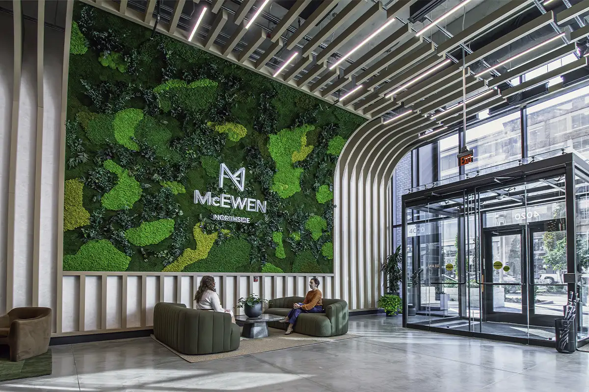 Understanding ICF’s mission as a global consultancy rooted in ingenuity, IA Interior Architects envisioned a bespoke world map moss wall installation for the Reston corporate office. In collaboration with IA and HITT Contracting, Green Oasis was tasked with creating a preserved moss feature that reflects ICF’s international reach while supporting the project’s LEED certification goals. The vision: a dimensional green wall that embodies creativity, sustainability, and global connection.